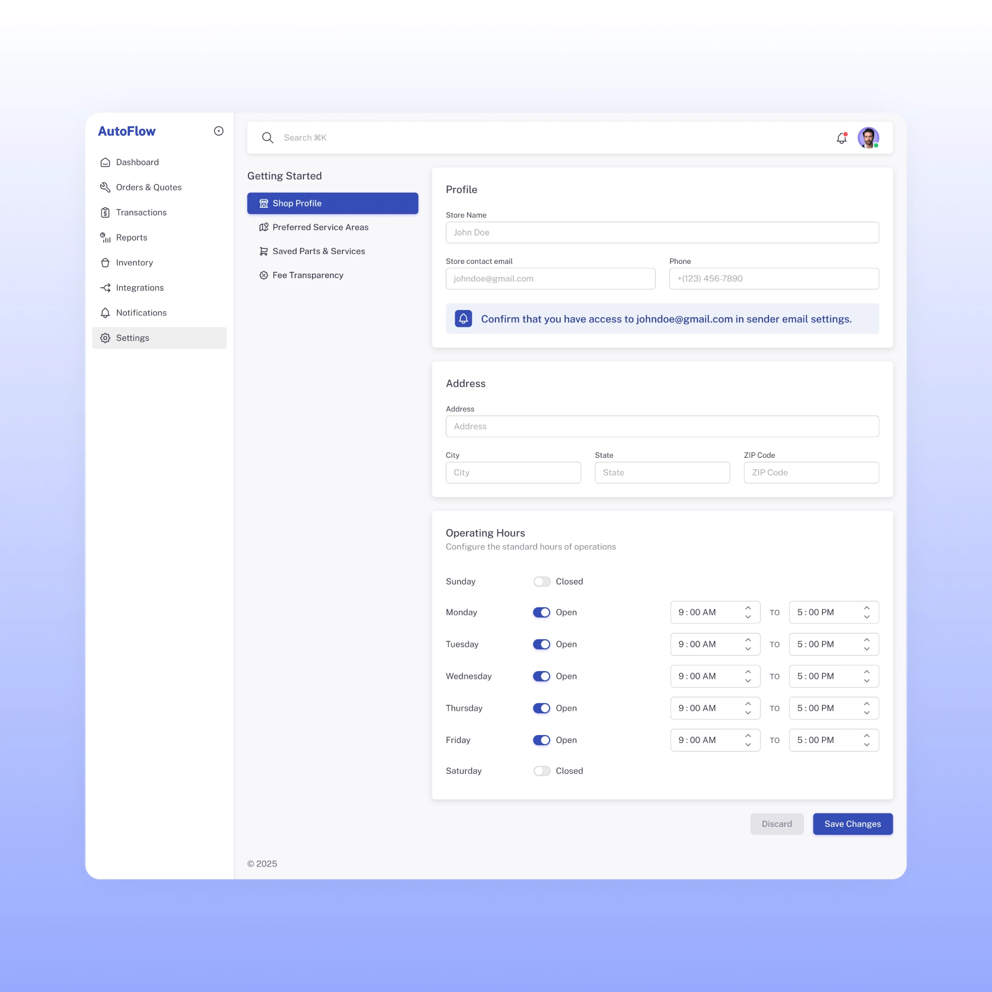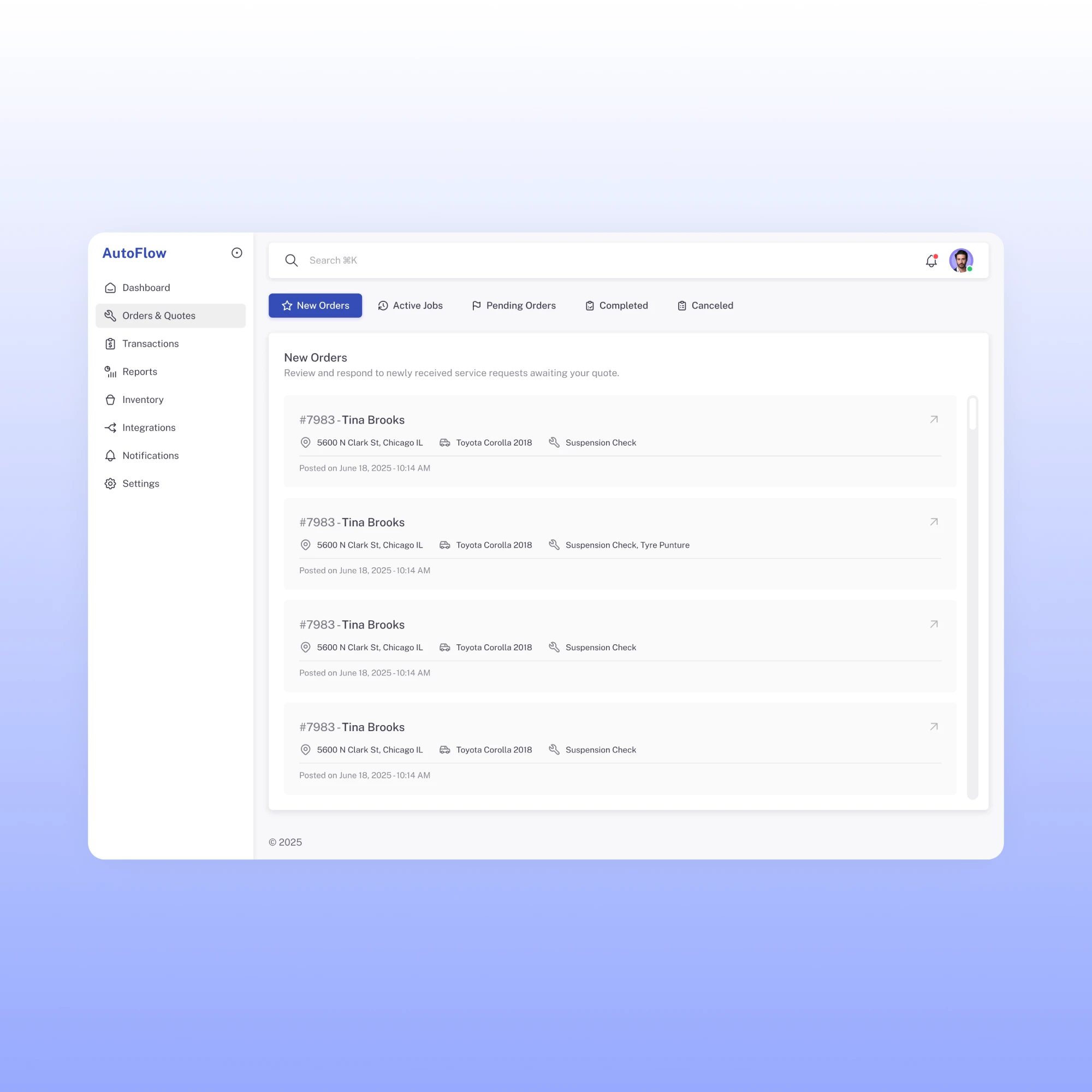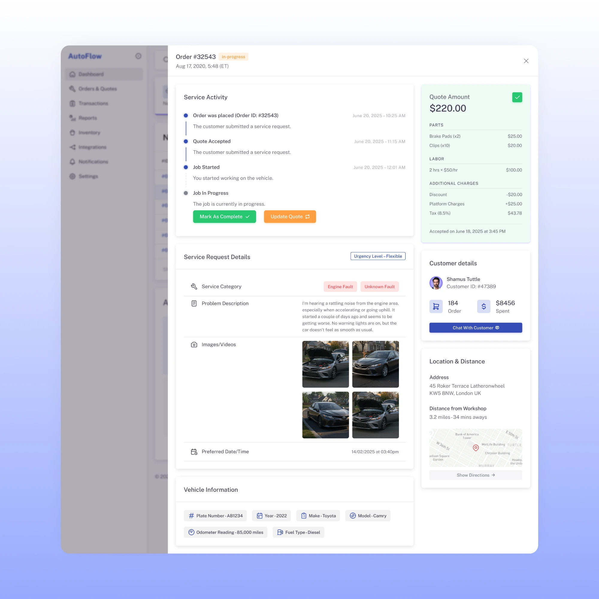 AutoFlow is a comprehensive service-request platform designed to simplify automotive repair management for shop owners, customers, and administrators. This case study focuses specifically on the Shop Owner Panel, emphasizing streamlined job management, financial tracking, clear communication, and intuitive user experience. As the lead UI/UX designer, I developed a dashboard tailored explicitly to automotive workshop owners, enhancing operational efficiency and customer satisfaction.