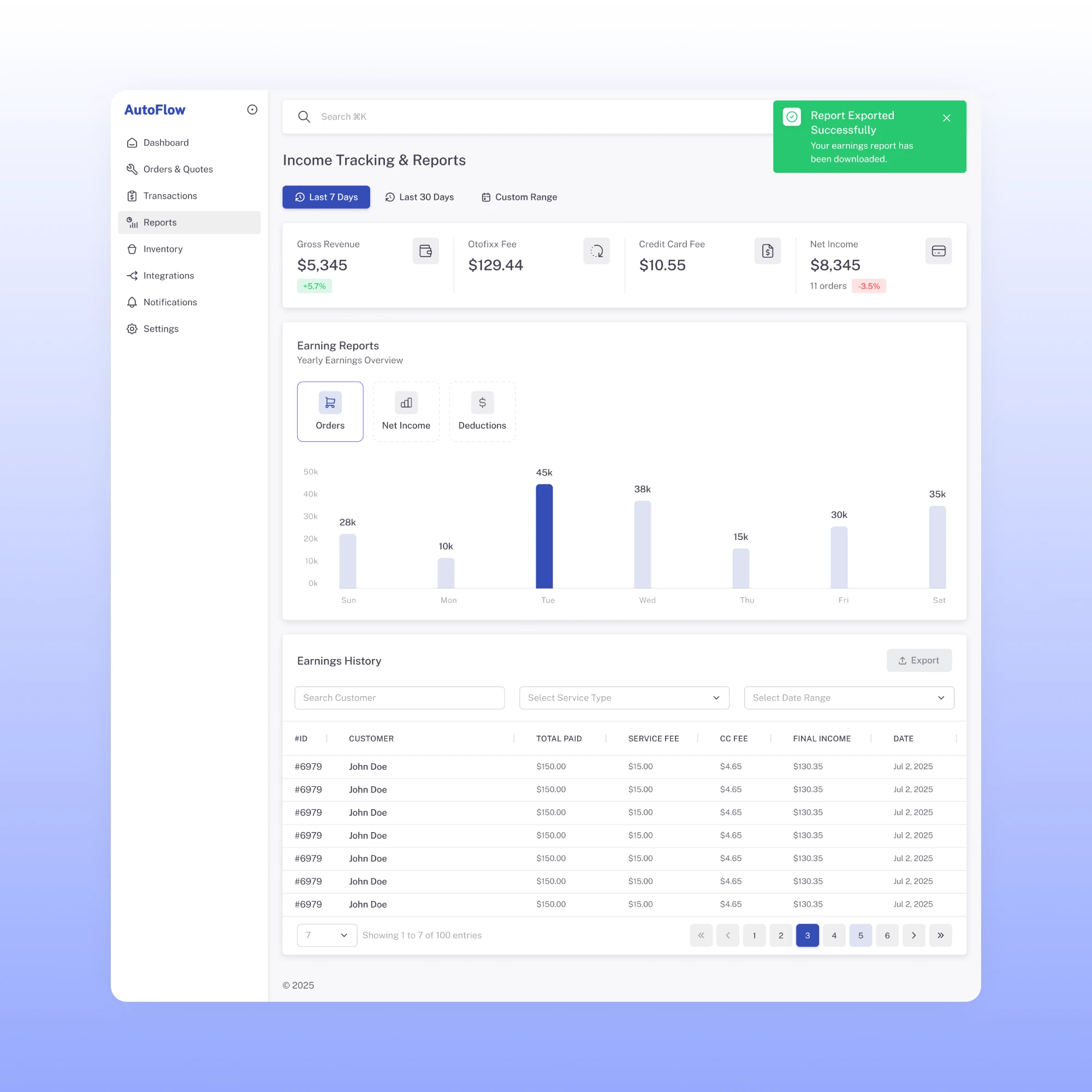 The finalized design delivered an intuitive, powerful dashboard enabling shop owners to manage repair jobs effortlessly, track income transparently, and communicate efficiently with customers. Key workflows like order management, quote submission, transaction handling, and detailed reporting were refined through user testing, resulting in enhanced productivity, reduced response times, and greater financial clarity.
